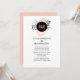 Minimalist wedding invitation, done in white with a splash of blush peach watercolor, at the top, with a simple black floral decoration. A black disc text area has the bride and groom's initials in peach. The back is done in a solid blush peach. Personalise the custom text for your special day.