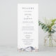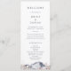 This simple floral mountain wedding program is perfect for an outdoor wedding. The modern minimalist design features a navy blue watercolor mountain with blush pink moody fall wildflowers. Include the name of the bride and groom, the wedding date and location, thank you message, order of service, bridal party and an optional "in loving memory" memorial.