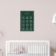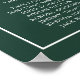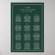 Simple wedding seating chart poster featuring a modern yet elegant design with your two letter monogram, names and date with the chart below, surrounded by a thin border. The template has three columns with twelve tables of eight guests as an example, but can be customised for your number of tables and guests. All text is in white over a forest green background and may be changed to any colour you wish in the design editing tool. A chic and stylish wedding seating chart design that is great for a minimalist couple.