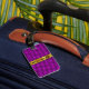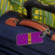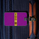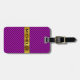 This luggage tag design features a simple pattern of alternating black and fuchsia lines/stripes. It also features a personalised name on the front within a faux gold coloured area, and personalised contact info on the back.