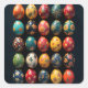 A grid of twenty-five vibrantly decorated Easter eggs arranged on a plain black background. The eggs are featuring a unique, intricate design. The color palette is rich and varied, including shades of orange, yellow, red, teal, green, and black. The decorative patterns consist primarily of floral motifs and starburst designs, rendered in contrasting colors like gold, white, red, and black.
