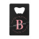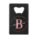 Girly, modern, elegant, minimalist blush pink and black, white monogram initial name script custom personalised monogrammed Credit Card Bottle Opener. Featuring a monogram initial and a girly name script in a hand lettered calligraphy font with swash tails and dotted circle frame around your monogram. Perfect feminine gift for girlfriend, sister, mother, birthday, wedding, bridal shower, sweet 16 birthday party, or anyone who loves pretty glamourous style.