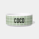 Modern geometric monochrome grid pattern girly sage green customisable pet bowl, cute accessory. Ideal gift for the pet owner in your life, personalised with names in a sage green colour way