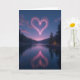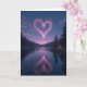 This greeting card shows a quiet night scene with a deep blue and purple sky over a dark, still lake. Floating above the water is a large heart made from tiny glowing pink dots, like glittering stardust. The heart shines softly and its reflection appears in the lake below, slightly blurred but clearly the same shape. Tall evergreen trees line the shore in dark silhouettes, framing the view and making the heart feel even more special. On the right side, one tree is lit with a warm yellow glow, adding a small, cozy touch against the cool night colors. There’s no text on the front, so the image does all the talking and leaves room for your own words inside 🥰. It feels meaningful to give because it captures that calm, steady kind of love and the feeling of being close even in quiet moments ❤️.