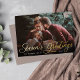 Elegant Christmas photo card features a single horizontal or landscape-orientated photo with "Season's Greetings" overlaid in gold foil calligraphy script lettering. Personalise with your family name or individual names and the year beneath in modern white lettering. A simple and chic choice for your holiday greetings.