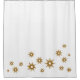 Modern shower curtain features a simple gold starburst pattern on a white background. Each starburst features a light golden star overlapping with a larger sparkly copper starburst. A simple, clean minimalist design,