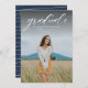 A simple classic script "graduate" in white accentuates a single vertical photo of your grad. This graduation announcement works for both college or high school graduates and is simple enough to let your photo shine. It's a timeless design and also features a striped backer with a customisable colour (default is a classic navy blue). The words are at the top of the photo but the design is also available with the words at the bottom.