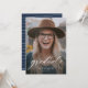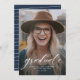 A simple classic script "graduate" in white accentuates a single vertical photo of your grad. This graduation announcement works for both college or high school graduates and is simple enough to let your photo shine. It's a timeless design and also features a striped backer with a customisable colour (default is navy).