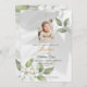 This beautiful baptism or christening invitation features a natural background with green leaves, white rose and a gold cross in the centre. The back of the card is green leaves and white rose.