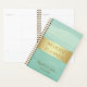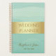 Simple, elegant watercolor mint green wedding planner with yellow gold foil details and couple names, for modern brides.