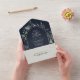 Enjoy a minimalist watercolor greenery & eucalyptus illustration over a navy blue background combined with an elegant calligraphy typography. This all-in-one sustainable invitation would save you money, no need to include RSVP envelopes, your guests will tear away the last panel and mail it back to you as a postcard.