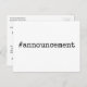 This straightforward design gets right to the point. In a friendly typewriter font, I've placed "#announcement" in the centre of the front. Maybe you'd like a different hashtag. That's an option!On the reverse is a more traditional setup with additional fields for a variety of important details. Change any of these as you see fit. You may also change font and background colours if you wish.