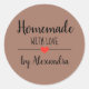 Simple "homemade with love" sticker with a black font on a mellow brown background embellished by a cute red heart. Customise text.