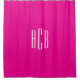 Modern three letter monogram design in white on solid hot pink shower curtain.