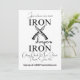 Minimalist Iron sharpens Iron with crossing knives, Christian Men's Retreat Invitations. Simple modern black and white typography. Proverbs 27:17 in the King James Version of the Bible says, "Iron sharpeneth iron; so a man sharpeneth the countenance of his friend". KJV scripture verse. Add your Church Name/Venue or City/Date of Event/Website or RSVP info.