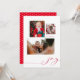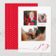 This customisable holiday photo card features three photos accented by the word joy in red. The back has a fun and festive red and white polka dot pattern.