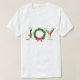 Modern men and women t-shirt with a traditional inspired Christmas JOY floral script lettering with holly berries, a green fir branches wreath, and a red bow. It makes a great Christmas gift for your loved ones to celebrate a happy holiday time together!