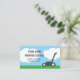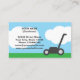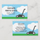 Simple lawn mowing service business card template for gardener. Cute design with mower, green grass, blue sky and white clouds. Perfect for self employed gardener or landscaper taking care of private gardens, yards, fields, parcs and more.