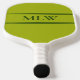 This acid green pickleball paddle has three white letters in the centre. You can change the letters to display the correct monogram. Two white horizontal lines are above and below the initials.