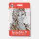 A minimalist and simple design featuring a light red coloured background, large photo, barcode and logo template. Easily customise this badge to your brand. -designed with ❤ by Zaubershirts-