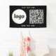 Simple logo with text and QR code to promote your business. Replace the logo and QR code with your own, and change or remove the text to customise. Minimalist and professional to reflect your brand. White on a black background.