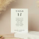 Simple, minimalist black and white wedding table number card with guest names seating chart.