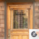 Introducing our Simple Minimalist Black Opening Hours window decal, designed to enhance the visibility and professionalism of your storefront. Perfect for any business, this modern minimalist decal clearly displays your opening hours, phone number and website information, ensuring customers are well-informed. The simple and clean, black lettering and design on transparent background seamlessly blends with any business aesthetic, providing a simple yet elegant look. Ideal for use on business windows, this custom window cling also includes space for your phone number and social media handles, allowing customers to connect easily. Whether for a restaurant, retail store, or office, this opening hours window decal helps you present a sophisticated and professional image.