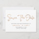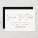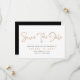 Modern minimalist cooper gold script save the date card. This elegant card features of handwritten script in cooper gold colour on white background and wedding details and names written in capital lettering in black colour. Back of the card is deep black. To edit this template click customise further.