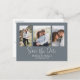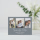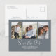 This design features a simple minimalist dusty blue photo, a QR code website online information, three 3 photos simple elegant, multi-photo couple engagement picture, weddings modern simple elegant, engagement photos budget postcard, calligraphy brush script, minimalist calligraphy script typography, modern brush script simplistic, budget-friendly save the date