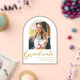 Simple Modern arch graduation announcement card featuring elegant gold script typography on a clean white background with an arch photo of the graduate, name of school, class year and name. Congratulations!