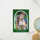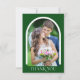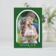 Send your wedding guests this simple modern photo thank you card. The design features an arched photo on the front and a second rectangular photo on the back along with custom text for a personal message. The background is emerald green.