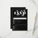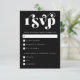 This simple modern wedding RSVP invitation has an elegant, decorative serif font and classic standard typographic fonts (Futura and Garamond Italic).