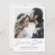 This simply chic photo wedding save the date flat card template features a simple design with a warm, minimalist flair and understated borders. All of the text and text elements on both sides are an elegant medium dark shade of blue. The front features your first names under your favourite photo and a unique 'Save our Date' message in handwriting that we first wrote by hand and then adapted for this card. We've also included this on the back. On the back you can of course in addition to replacing our sample info with your own, delete text fields that you don't need, or change the wording, as well as change font, text size, etc. You might for example change 'are getting married' to 'are tying the knot', etc. or delete the sample website address without replacing it with your own, or replace it with an entirely different message. The default background colour on both sides is set as transparent, to let the paper colour simply serve as the base tone. But you can edit this and choose a specific colour for the background on one or both sides to suit your style. Customise this elegant modern wedding save the date flat card template with your photo and your inspiration and make it uniquely yours!