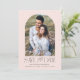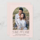 Announce your wedding date in style with our modern photo save the date. The simple save the date card features your engagement photo inside of a blush pink arch frame. "Save the Date" is displayed in black modern serif and script fonts. Personalise the front of the save the date by adding your names, wedding date, and wedding location. The card reverses to display a solid blush background.