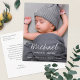 This simply charming photo birth announcement postcard features a contemporary design that's easily customised with your baby's photo, details and your message. Along with the full photo format, we've made your baby's first name the focus, presented in a modern script that's at once tidy and legible but also expressive, warm and familiar. Please note that if your baby's first name includes a lower case 'p', 'j' or 'y', the tail of the letter could dip into the text below it, and that might make this design more challenging to customise in such cases. The first name script and the other text on the card's front is a crisp white. You can change the colour and font of this or any other text according to your own taste, and we invite you to play with these elements. If you prefer a more minimalist look, you can delete without replacing any of our sample stats-you might not want to include the time of day or length, for example. We've set the background on the back as transparent, to let the colour of your paper simply serve as the base tone. You can change this by choosing a colour instead, be it a soft blue or pink or anything else. On back, we've added some placeholder text for you to replace with your own message. You can change the font and/or the text colour as well. The default text colour on the back is a grey tone. After you delete our placeholder text, you might decide to simply leave the back message part of the card entirely blank, so that you can add a handwritten message with your signatures after you receive your cards. Or you might enter a message and then sign the cards by hand after you receive them, rather than entering your names when you edit the other text. In any case, please do remember to remove all of the placeholder text on the back including the sample return address, placeholder text and sample names as well as the sample details and photo on the front! The default paper type, matte, has a soft warmth to it and resists smudging, so it's a great choice for writing your own message. But you can easily change it to semi-gloss if you prefer. Use the intuitive design tools, your favourite photo and your inspiration to personalise this custom birth announcement postcard and make it uniquely yours!