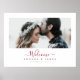 This simple, chic photo wedding welcome sign template features a clean, modern look in a horizontal format. We've given this minimalist design a splash of panache with "Welcome' in a flowing modern font that manages to be both elegant and fun at the same time. We love the graceful arc of the 'W' as well as the stylized, elongated flourish at both ends of the word. To highlight this aspect of the design we've chosen burgundy for the 'Welcome' part of the design in our example, making it an especially great fit for a fall wedding! But don't let this stop you from experimenting with different colors for the "Welcome' or for any other text in this design, for that matter. We've chosen black for your names below that, and a gray tone for your date at the bottom. Customize this poster with your favorite photo and make it uniquely yours! You can easily edit the text as well to suit your taste, and you can change the font and color of the text as well. For example, you can change 'Welcome' to another greeting of your choice, or you might choose to delete the date details in favor of another message or a blank space where that line of text is, if you prefer. You can also activate the black and white filter if you'd like to see how your color photo would look in black and white. And if you prefer not to use a photo, you can use your favorite illustration, etc. in place of a photo. Before you consider changing the color of the 'Welcome' text, please see our selection of various colors that we've already made for you, as you might find inspiration there, and maybe even your perfect color! And if you think you might prefer a similar look in a vertical format, we've also made a selection of wedding welcome posters in that style with a very similar look to these, with interesting differences in text placement and what text is included. A poster like this makes it easy to add flower arrangements, etc. on one or both sides on your special day to give it your own special look that reflects your style and the theme of your wedding party. And of course you can use it simply as it is, for a simply stylish expression of your feelings.