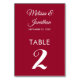 Simple and elegant minimalist wedding table number card featuring a stylish white script over a crimson red background. Easily customisable with the bride and groom's names, the wedding date, and the table number.