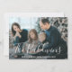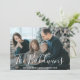 Send out holiday cheer with this modern flat Christmas card featuring two of your favourite photos and elegant typography. The front side has your last name in a large format white handwriting font over your favourite full bleed photo. The backside has the second picture with a simple white frame.