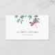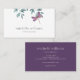 This simple modern garden greenery business card designs features a watercolor dragonfly. It is resting on a simple arrangement of natural watercolor garden greenery with a white background. The back is a solid deep purple that matches the dragonfly.