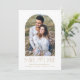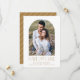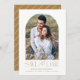 Announce your wedding date in style with our modern photo save the date. The simple save the date card features your engagement photo inside of a white arch frame. "Save the Date" is displayed in gold modern serif and script fonts with a white background. Personalise the front of the save the date by adding your names, wedding date, and wedding location. The card reverses to display a gold and white stripe pattern.