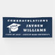 Simple and modern navy blue and white graduation party banner with a grad cap, the graduate's name, class year, and high school, university, or college name.