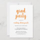 Simple graduation party invitation featuring a classic design with "grad party" and the graduate's name in a thick orange script handwriting over a white background. The backside is solid orange. An elegant invitation with a modern minimalist flair for a girl graduate.