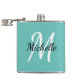 Flask with a light teal blue background and white custom monogram first initial and first name.