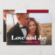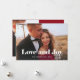 This simple and stylish holiday photo card says "Love and Joy" in bold, white elegant modern typography with your favourite personal family photo across the front of the card. Your personal holiday message can go on the back, with a minimalist red and white design.