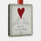The product design features two white doves roost together and look up towards a red heart. White doves are symbols of love, luck, peace, and prosperity. This simple birds illustration creates a modern and unique Christmas ornament with personalised text.
