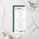 A chic and modern program card is framed with minimalist eucalyptus branches. The back lists the wedding party against a rich green background.