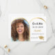 On front: Add your own vertical size photo of the graduate. Faux gold photo arch frame. A chic white background, black text. Templates for a name and date. The name and the text: Save the Date are written with a modern hand lettered style script. With a cap, tassel topper.