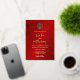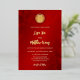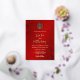 This minimal Chinese wedding invitation features a real gold foil double happiness symbol on a floral ruby red shimmering background. Bride and groom names in an elegant handwritten script. Chinese wedding invitation or tea ceremony invitation.