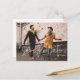 The front of this simple, modern Save the Date announcement postcard features a white script text overlay on a full horizontal photo of the couple, with the names and dates below in white sans serif font. Personalise the back with names, wedding date, website URL and other information, along with your return address.