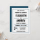 Simple modern wedding wedding invitation. Bold, black and white. Blue border accents and back side of invitation.
